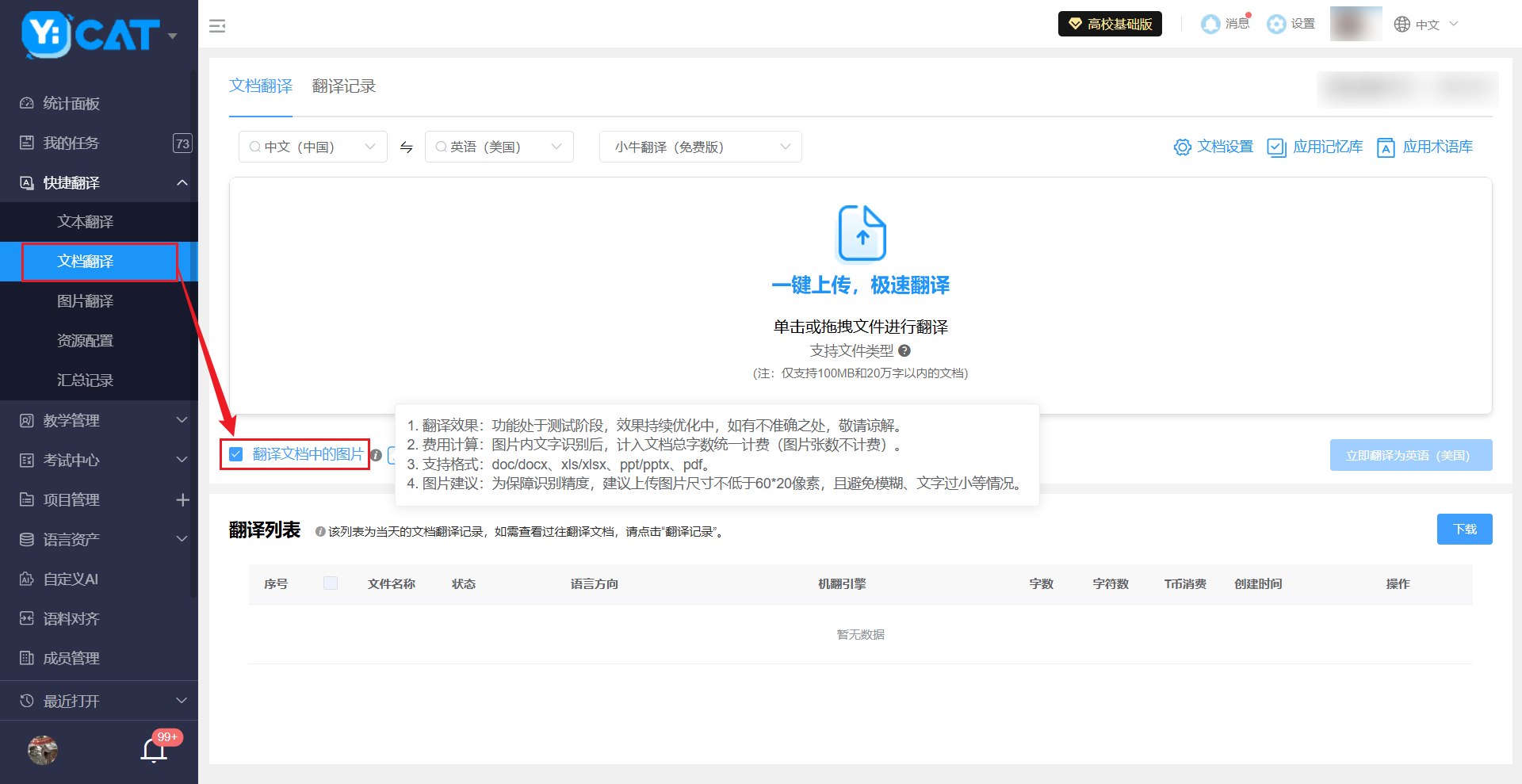 您可在【快捷翻译】-【文档翻译】时选择启用“翻译文档中的图片”,即可实现在翻译文档时,一并解析并翻译图片上的文字。