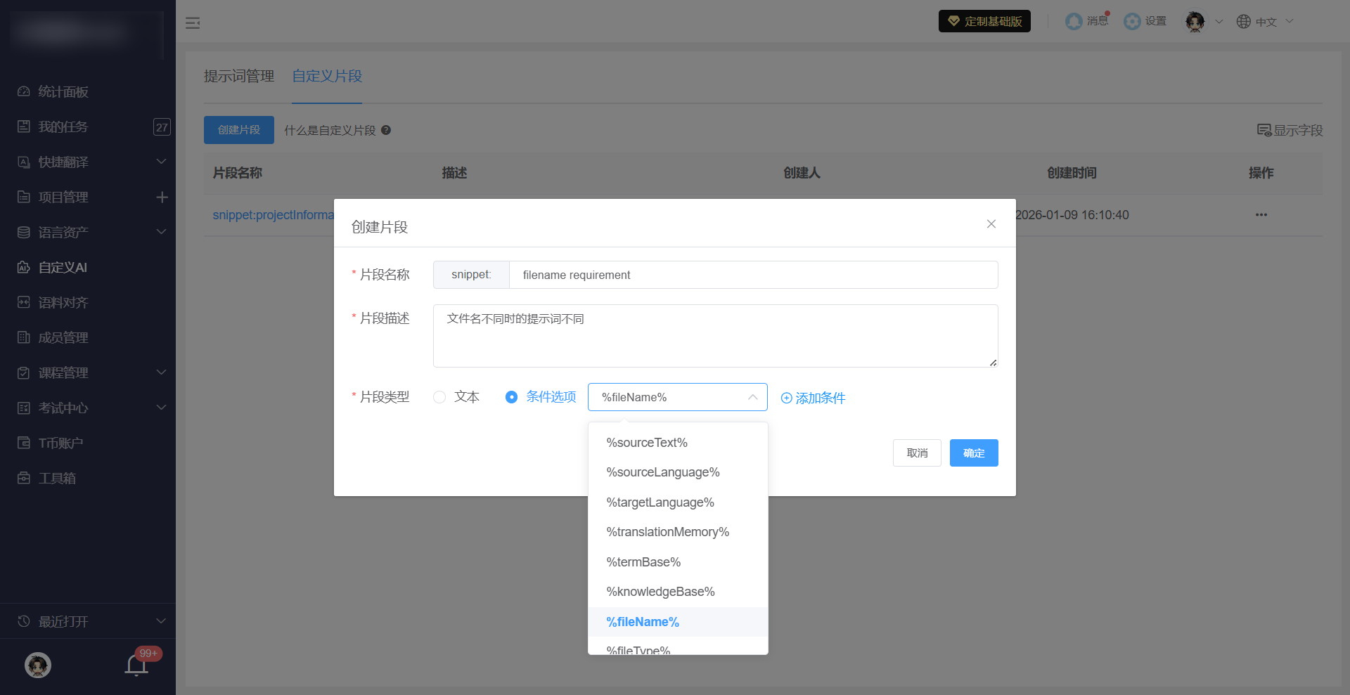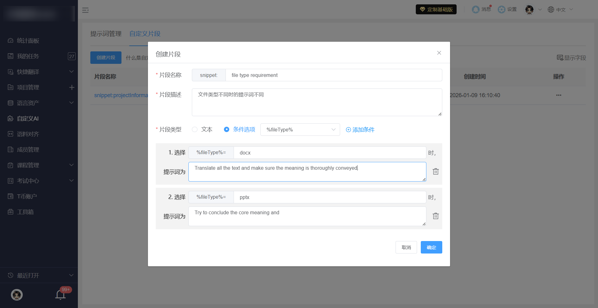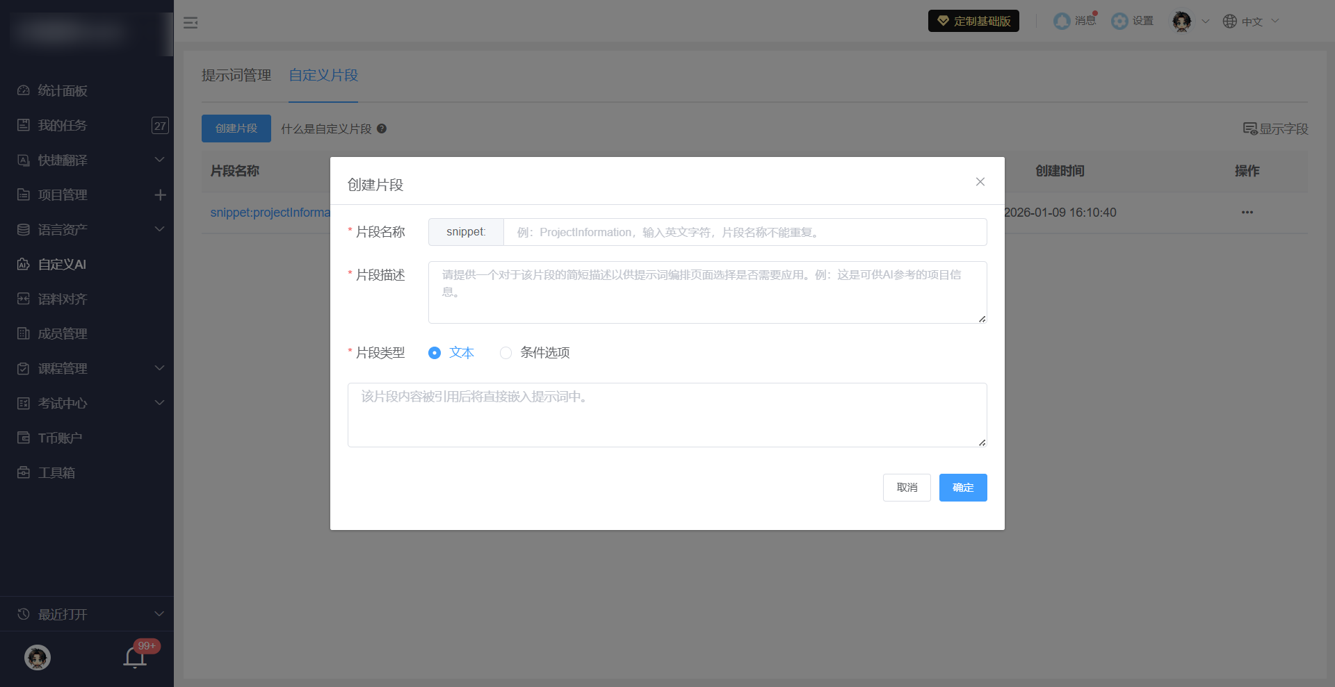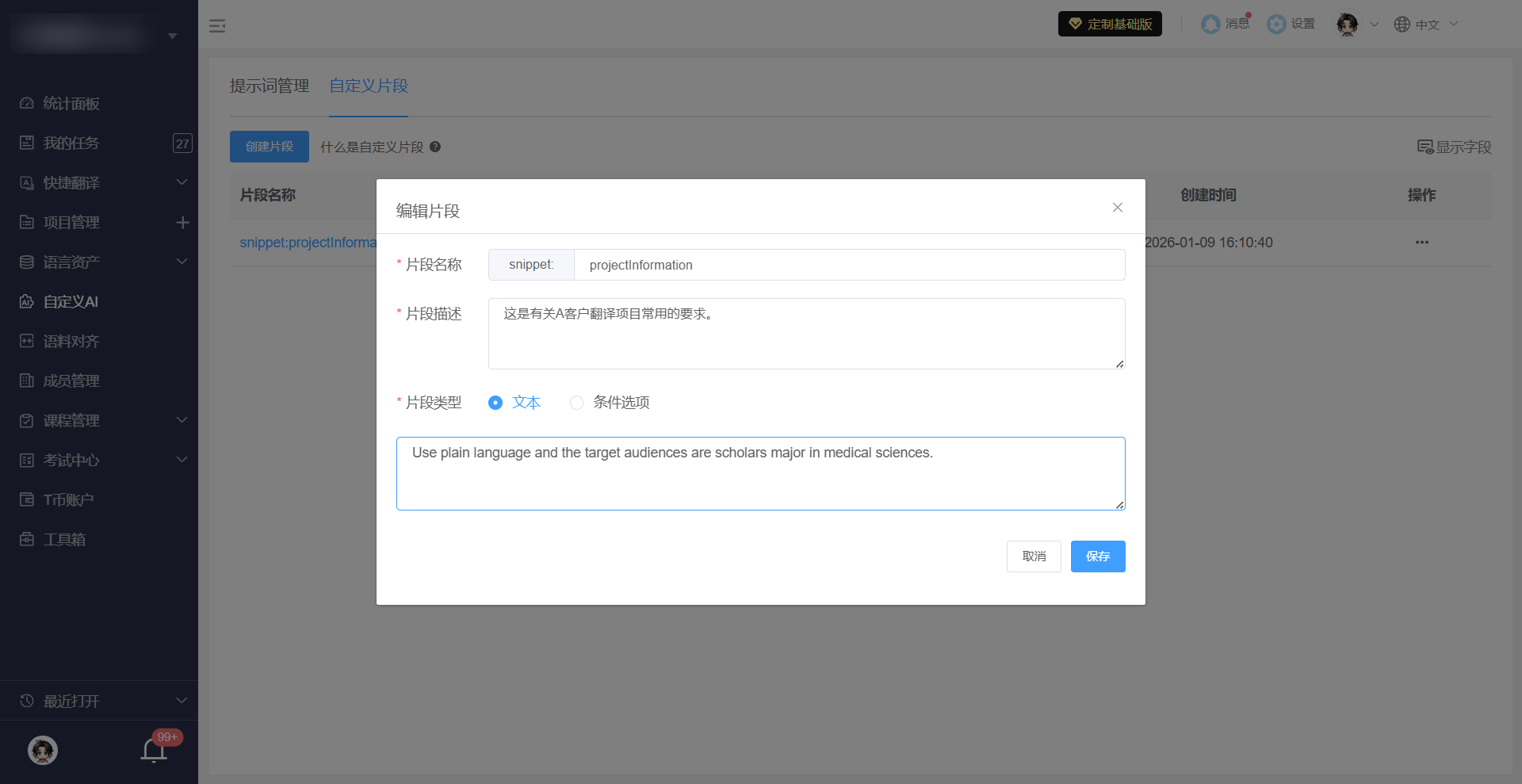 自定义片段是可复用的结构化信息块,用于帮助AI更好理解翻译任务的项目背景、风格描述、目标受众、特殊要求等。