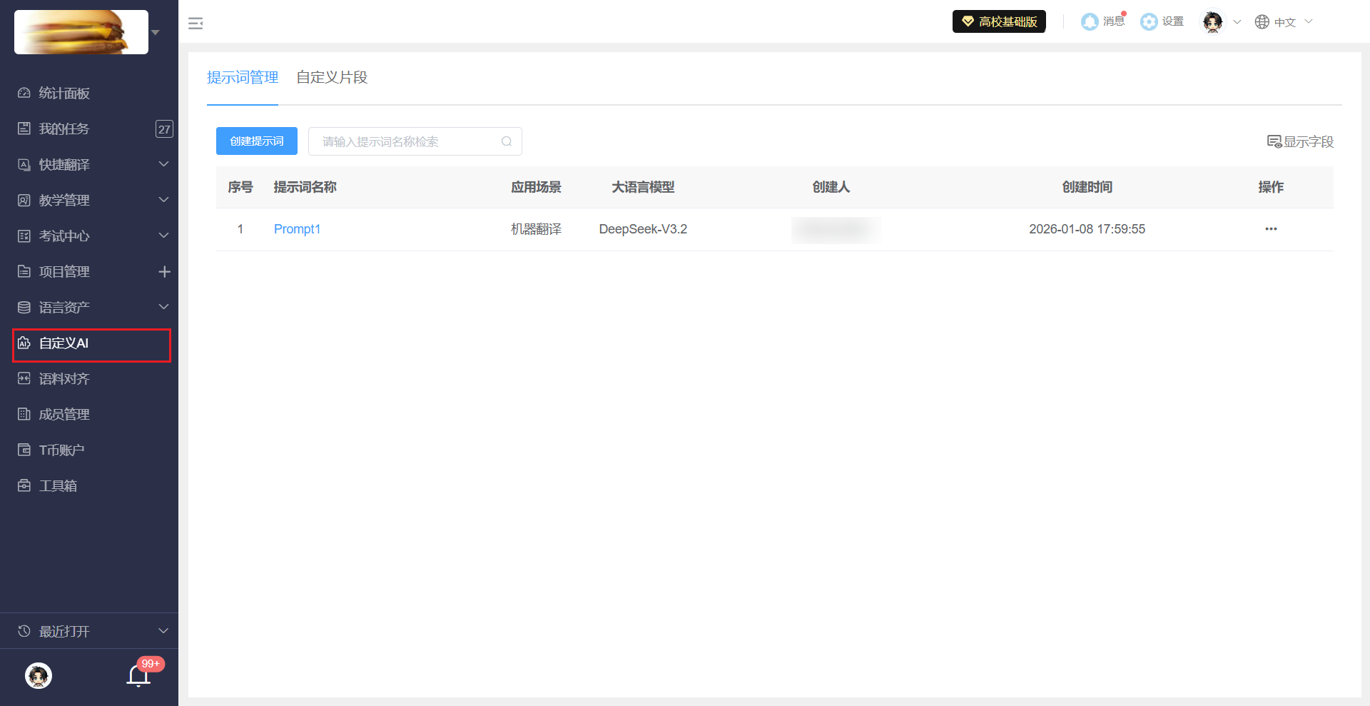 当前YiCAT所有版本均支持“自定义AI”功能。登录平台后,可在左侧导航栏找到【自定义AI】模块,点击后即可进入“提示词管理”页面。