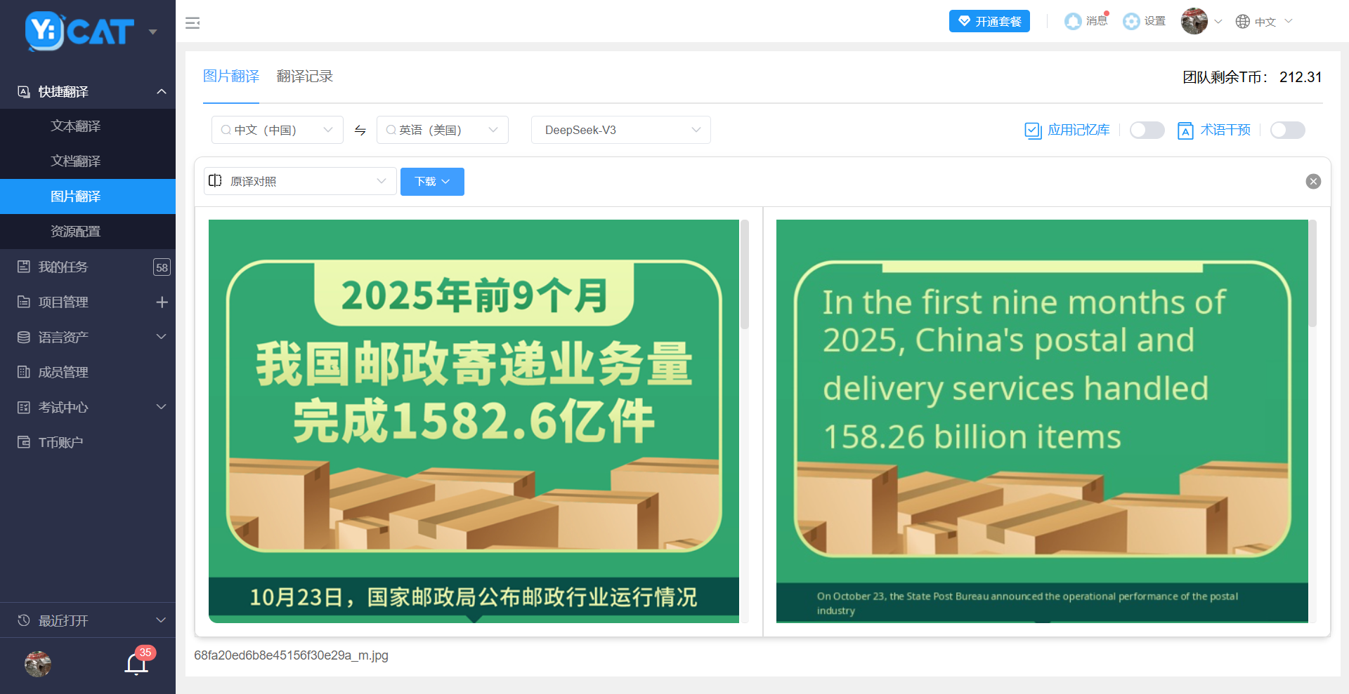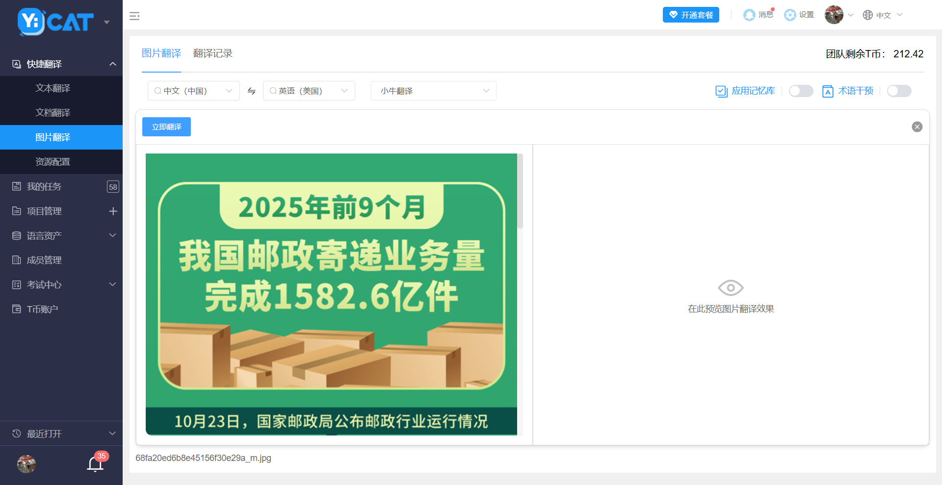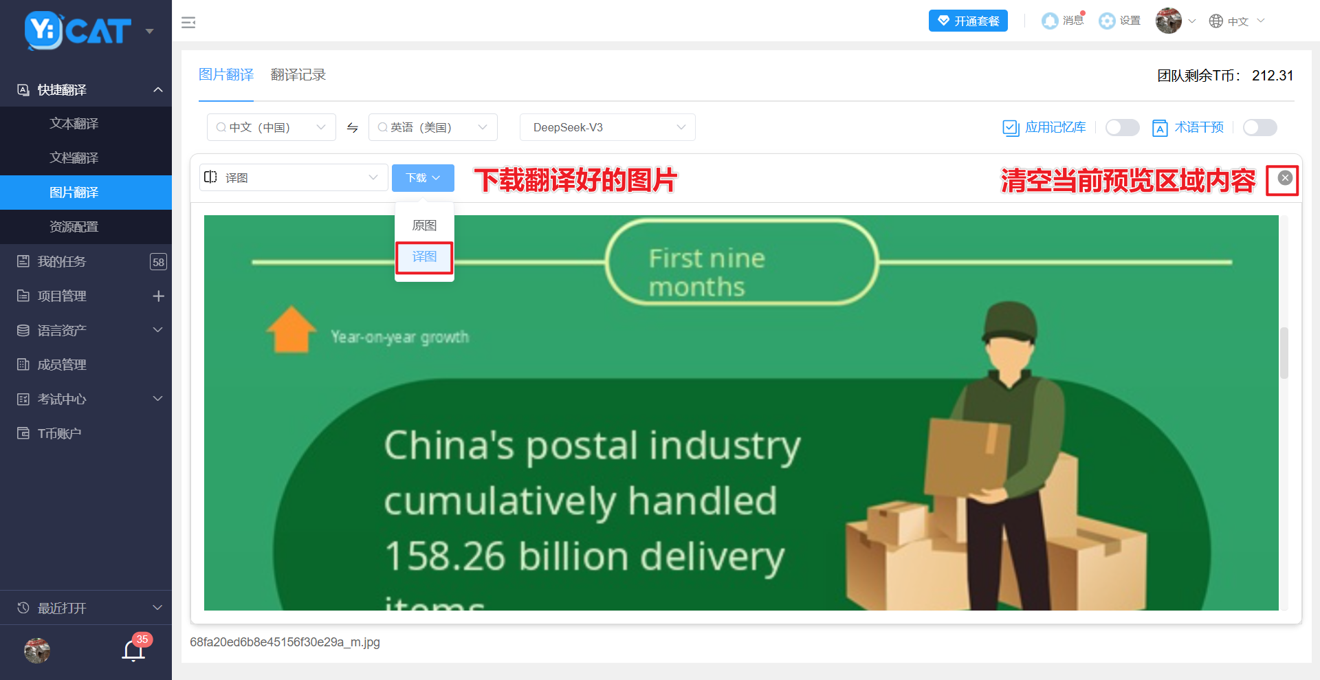 注:图片翻译时仅消耗团队T币(扣除所选机翻引擎、或开启术语干预时对应的机翻消耗),预览及下载译文不产生额外费用。