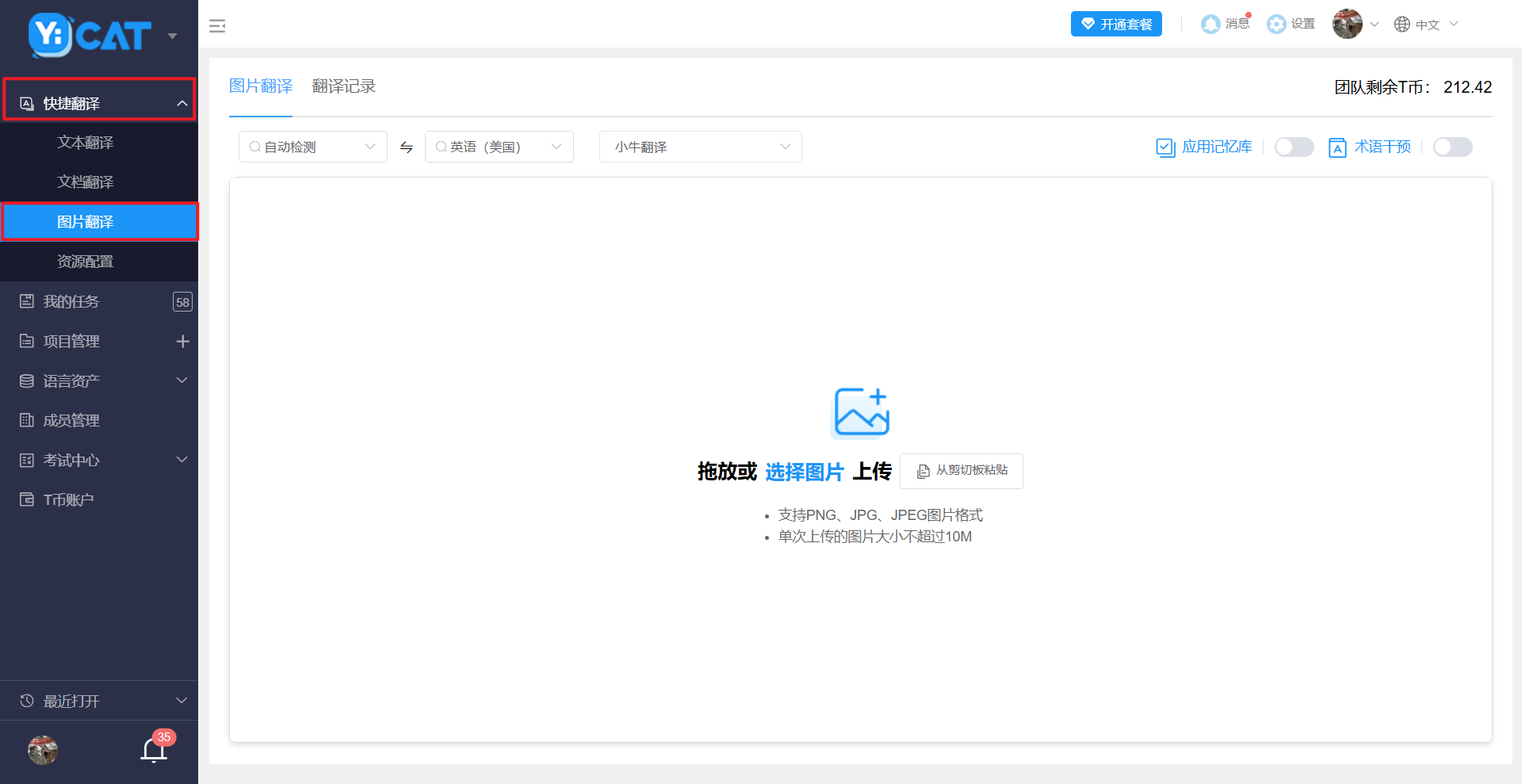 1.登录平台,在左侧导航栏【快捷翻译】下方找到【图片翻译】二级菜单。点击后,在右侧面板即可上传图片完成图片翻译,或选择查看翻译记录。