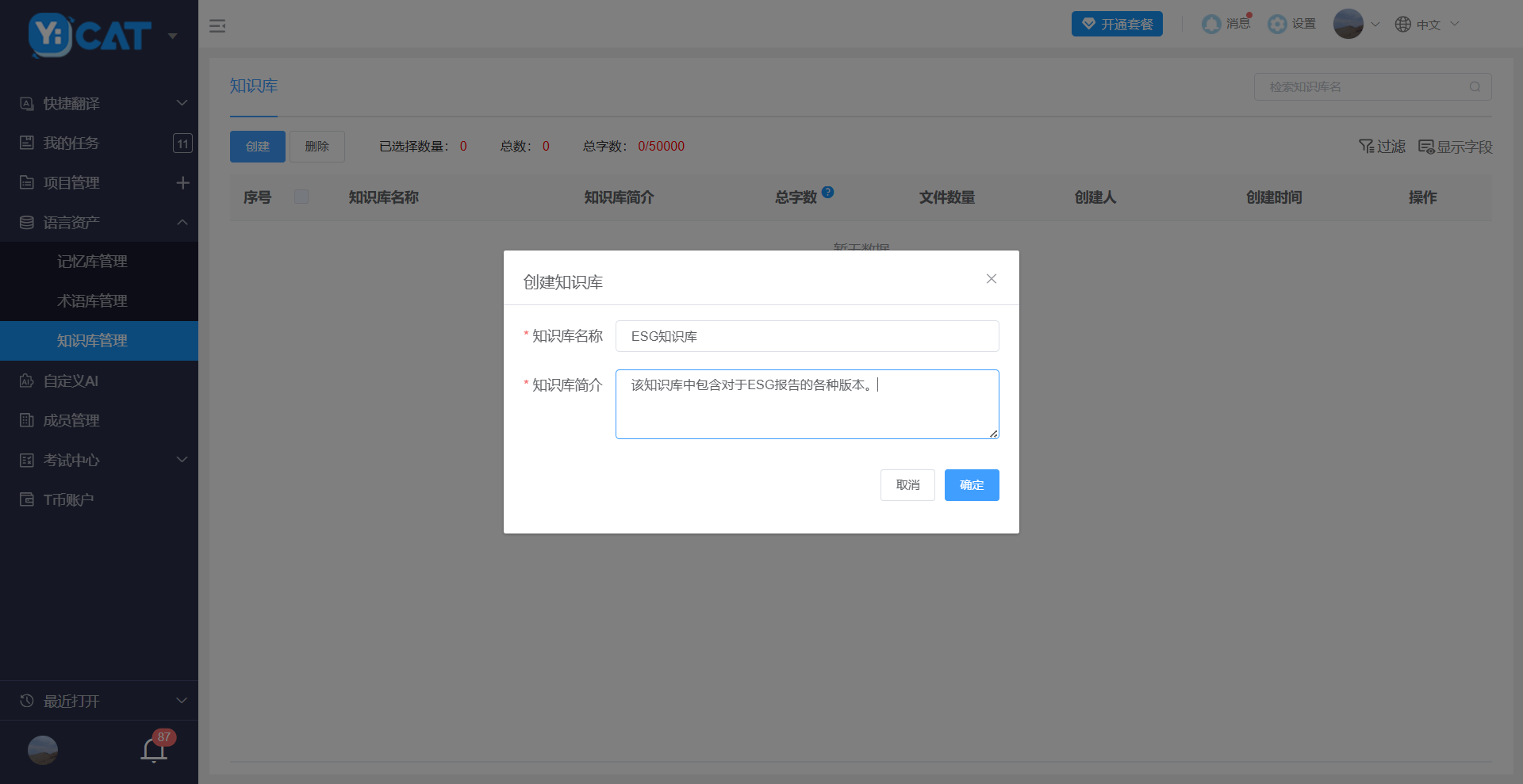 2.创建知识库的弹窗中,需要填写知识库名称和简介,皆为必填项。填写完毕后点击“确认”即可。