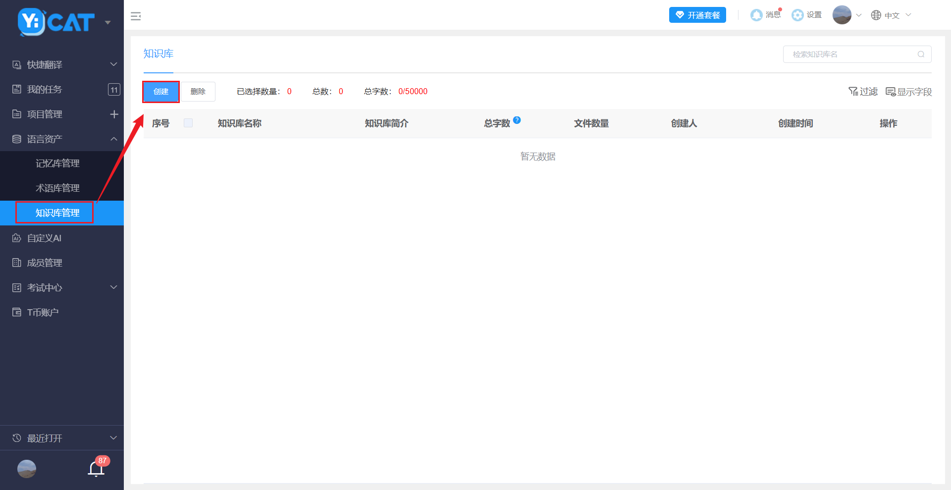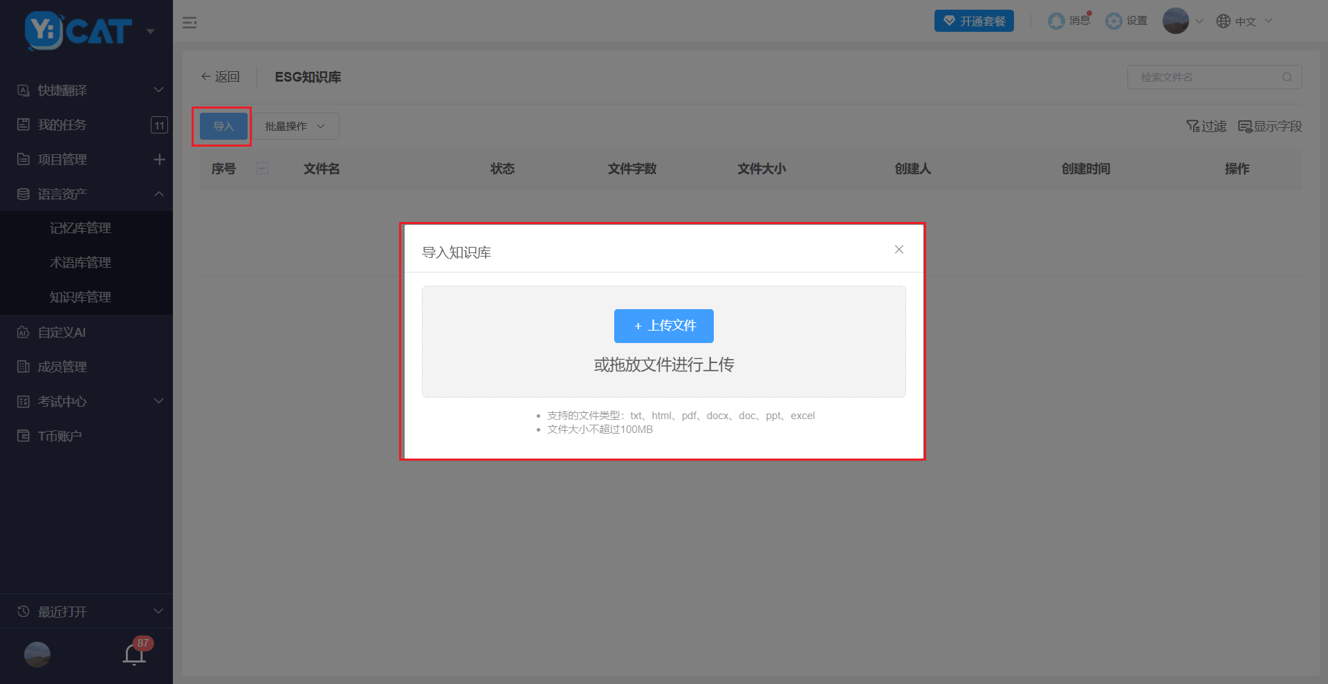 1.在语言资产-知识库管理界面,您可以创建知识库,随后在知识库中导入文件。