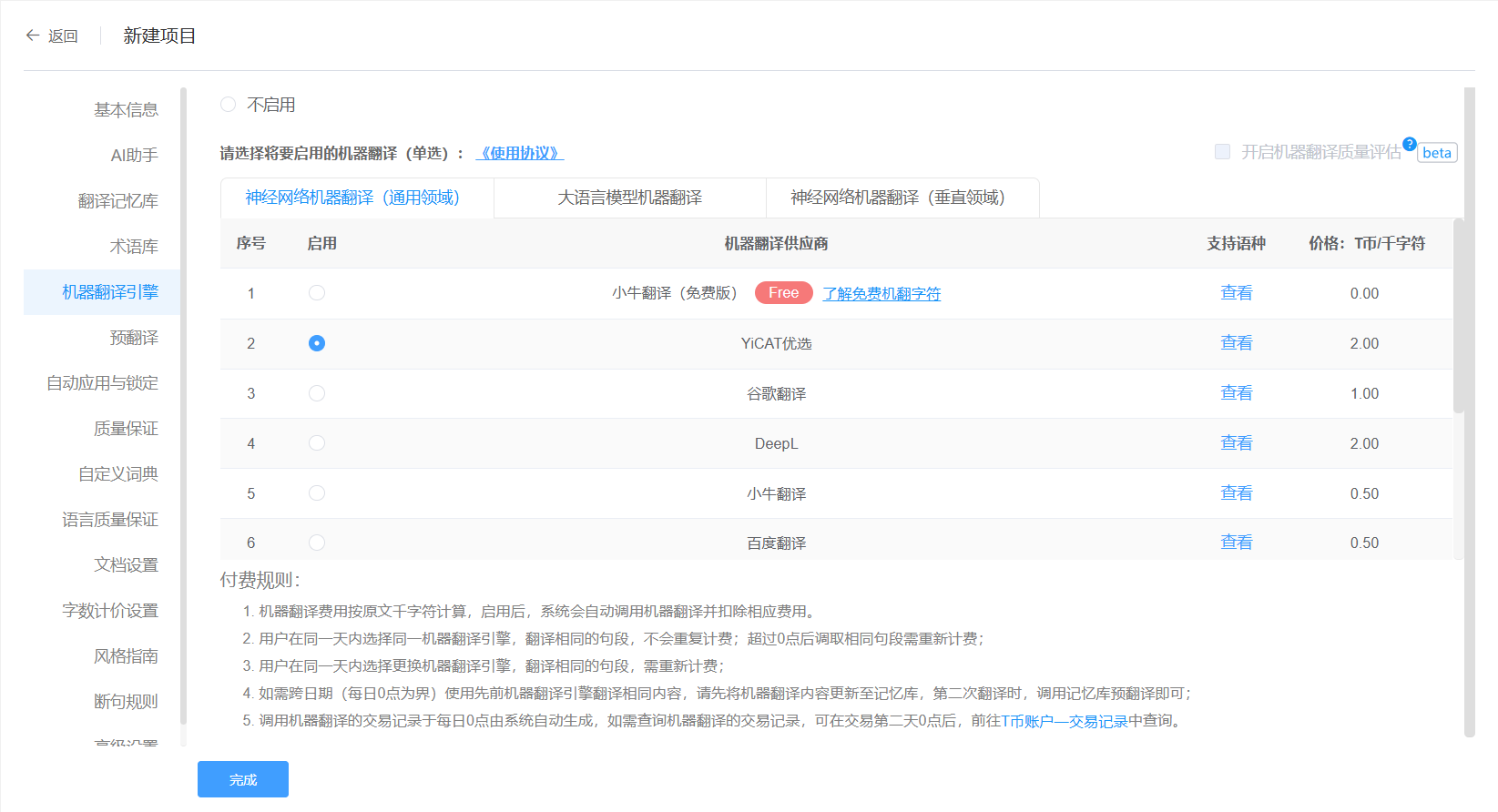 机翻引擎价格请以【项目设置-机器翻译引擎】页面为准。