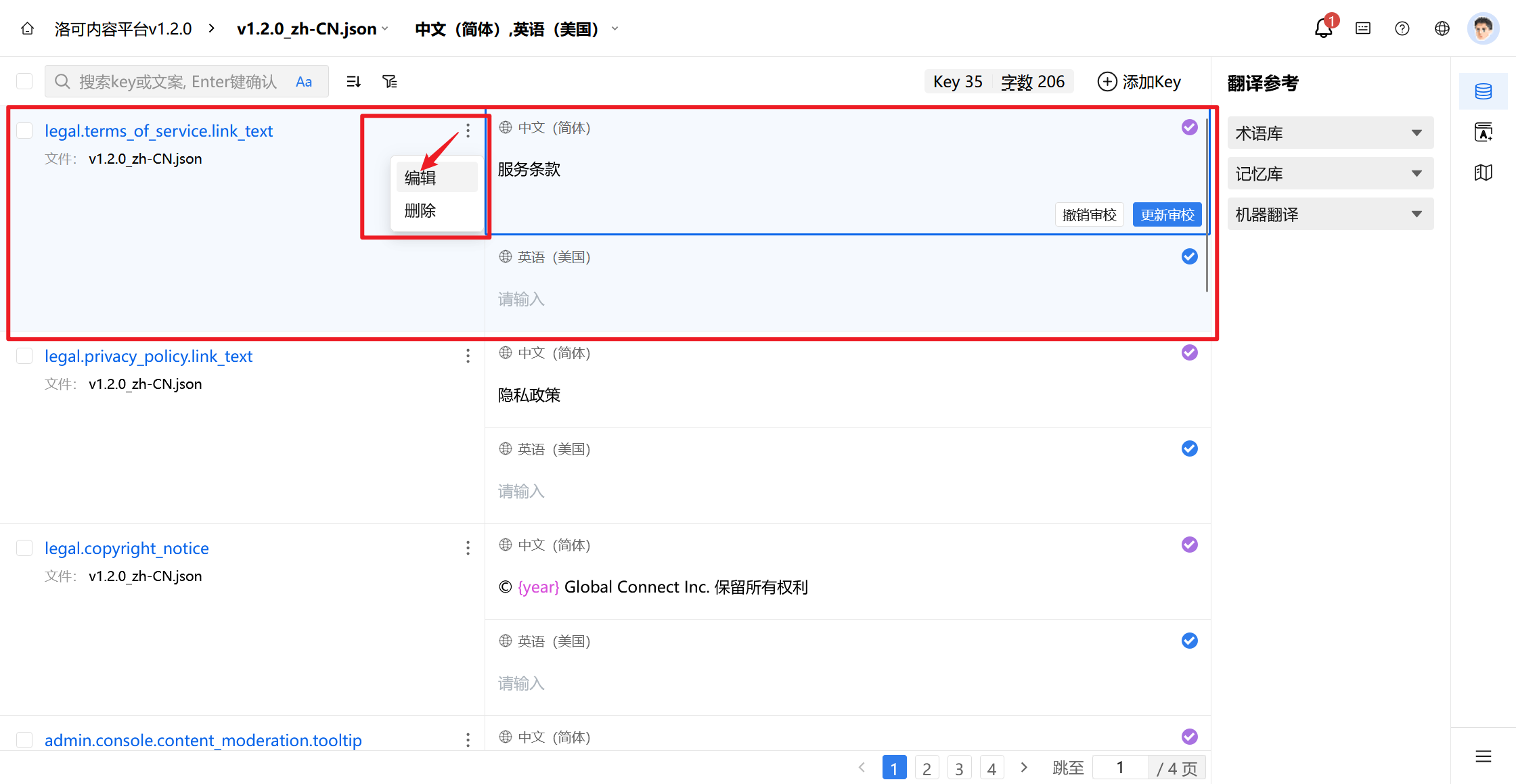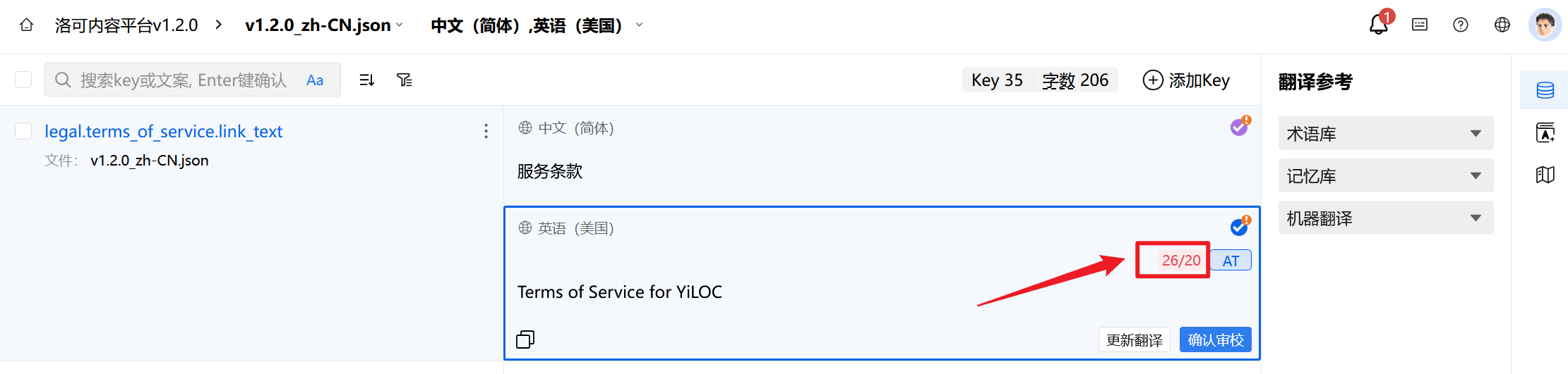 4. 设置成功后,在编辑过程中,如您输入的译文超过了设置的字符长度上限,则界面将标红提示字符数。
