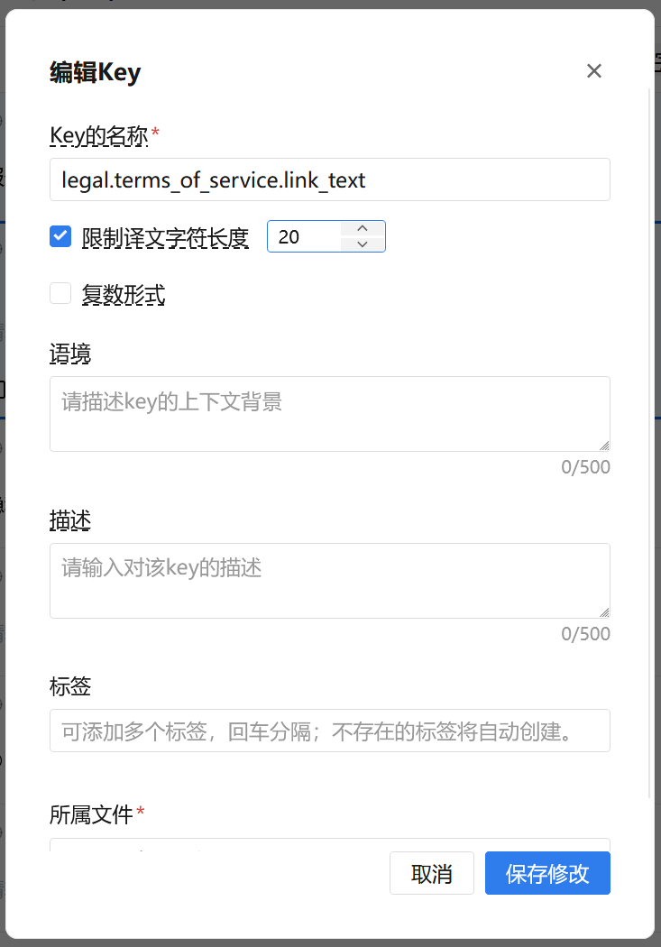 2.在编辑Key的弹窗中,选中【限制译文字符长度】选项,并填写字符数上限。