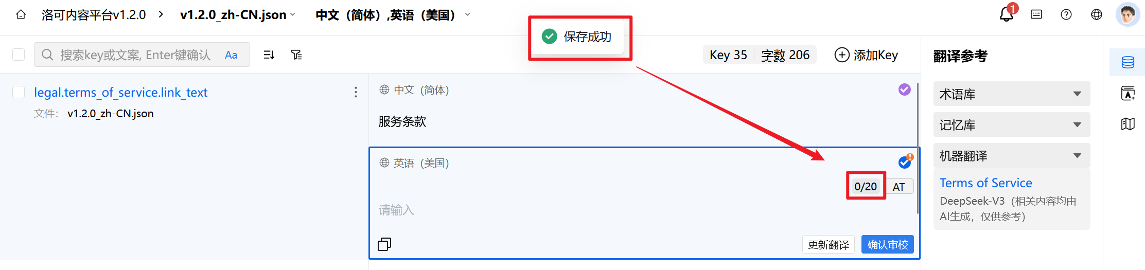 3.填写完毕后,点击【保存修改】按钮,系统将提示您“保存成功”。此时译文输入框中将显示当前译文长度和译文字符长度上限。