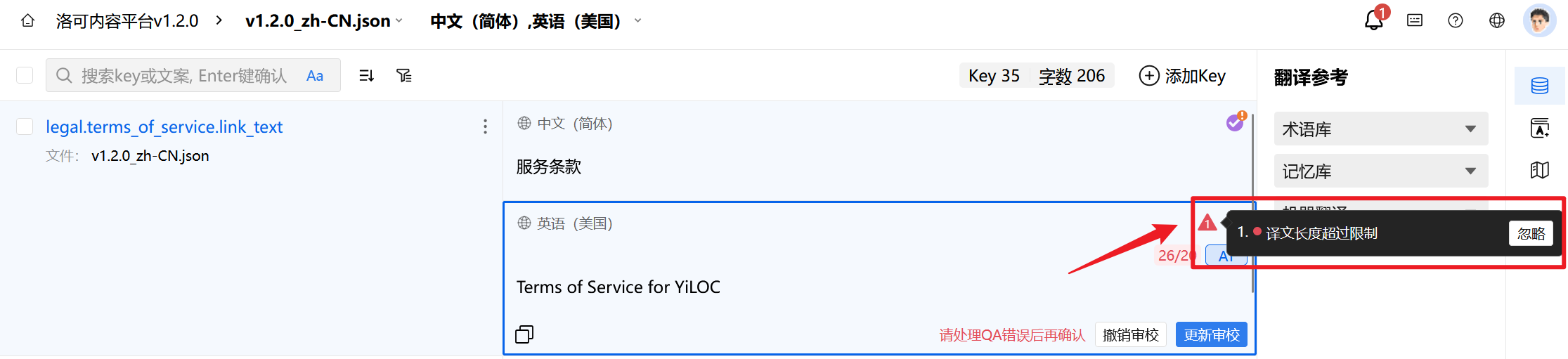 如该项目同时勾选了“译文长度超过限制”的QA规则,则界面将同时出现QA标识。