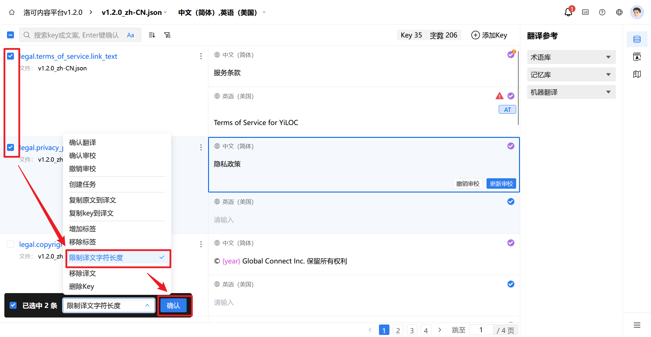 1.如您需要为Key批量设置译文长度,则可在编辑器中勾选多个Key,并在批量操作弹窗中选择【限制译文字符长度】选项,点击【确认】按钮。