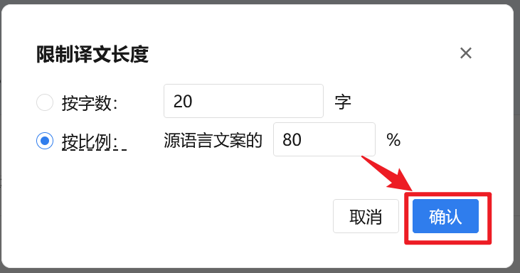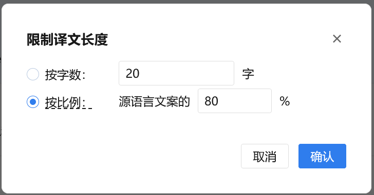2. 在【限制译文长度】弹窗中,您可以按照字数或者按照比例设置译文长度上限。