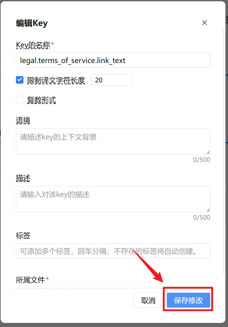 2.在编辑Key的弹窗中,选中【限制译文字符长度】选项,并填写字符数上限。