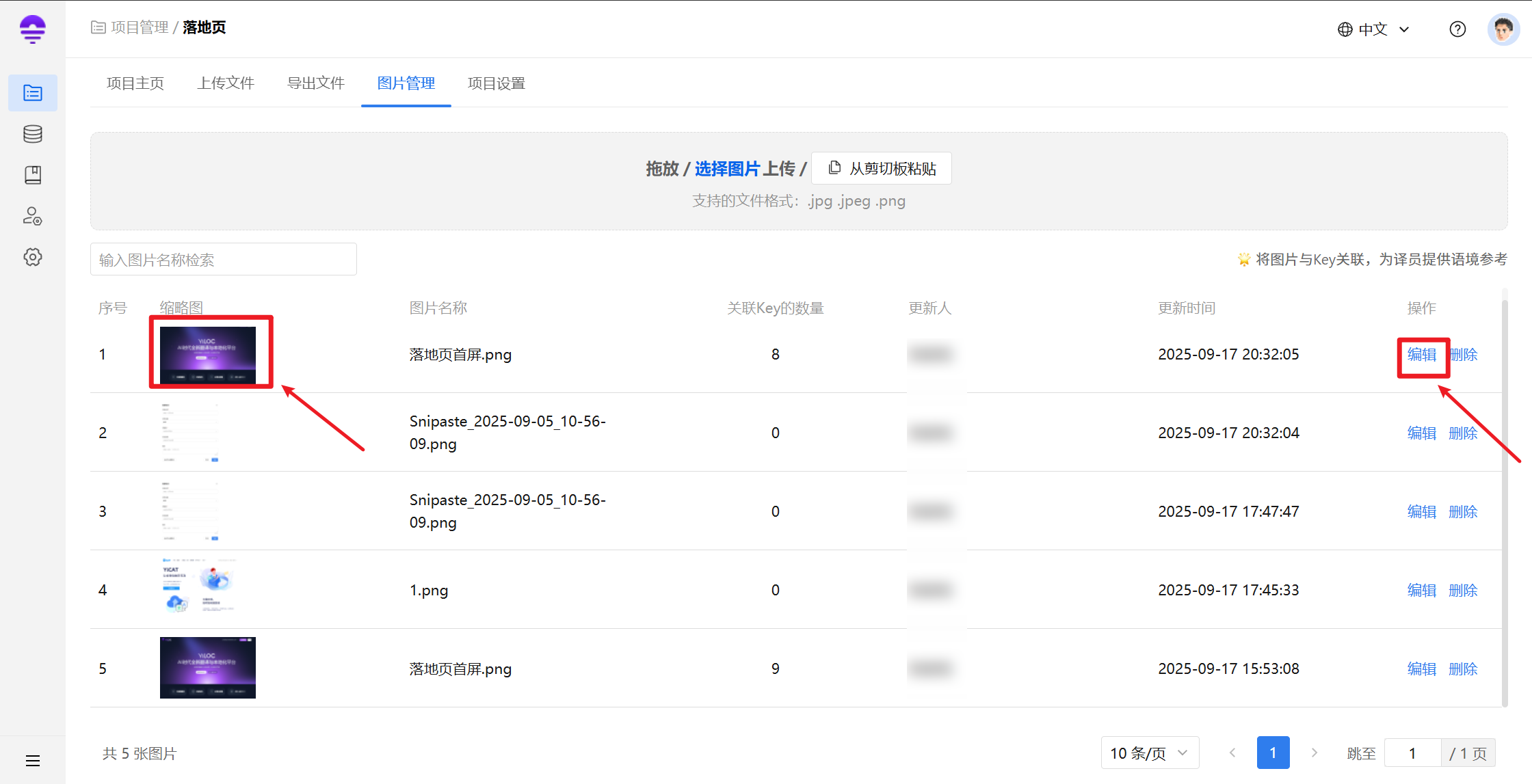 5. 点击右侧操作栏下方【编辑】文案,即可跳转至编辑界面,将截图与对应Key关联。