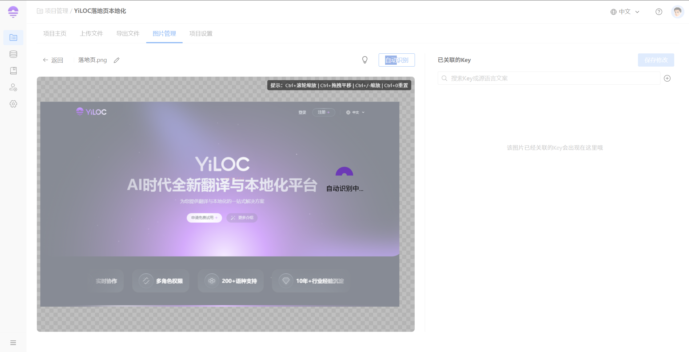2. YiLOC将会自动开始识别图片中的文案,并将其与项目中已上传Key的源语言或目标语言匹配,并关联相应的Key。