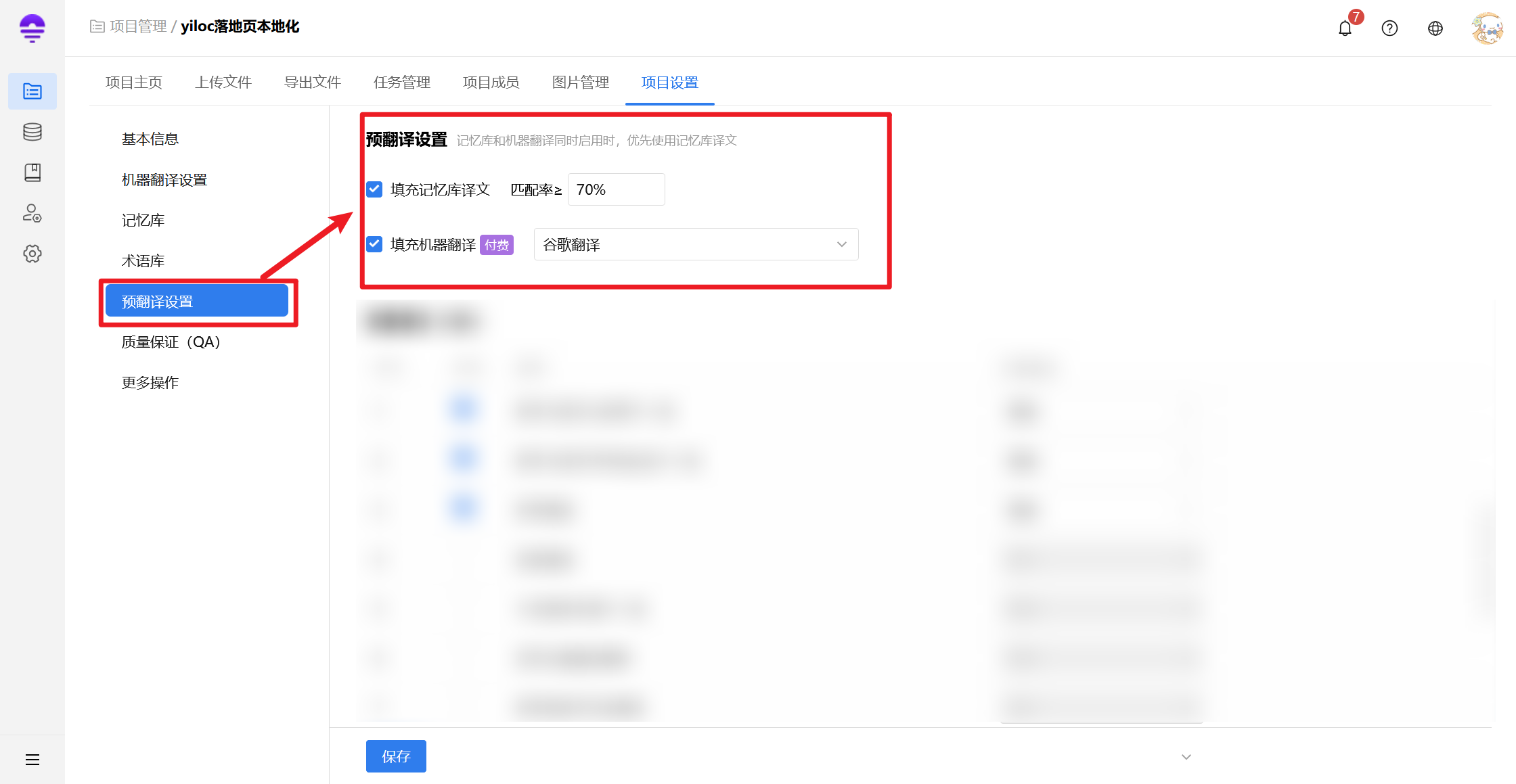 在【项目设置】-【预翻译设置】页面中,您可以对预翻译的方式进行配置。