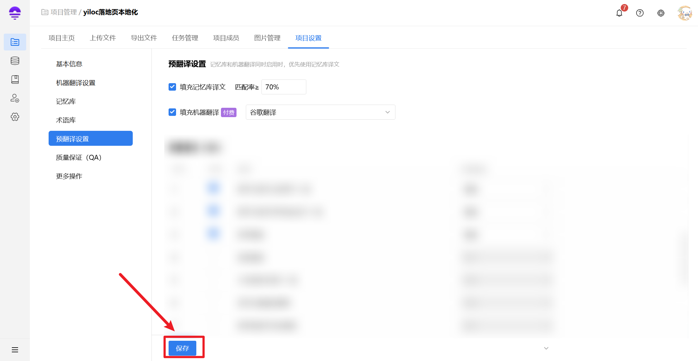 4. 项目设置完成后,点击保存项目设置即可,本项目中上传文件时的预翻译和在编辑器中执行预翻译都将以此设置为准。您可以随时修改预翻译设置,修改后即对新的预翻译操作生效。