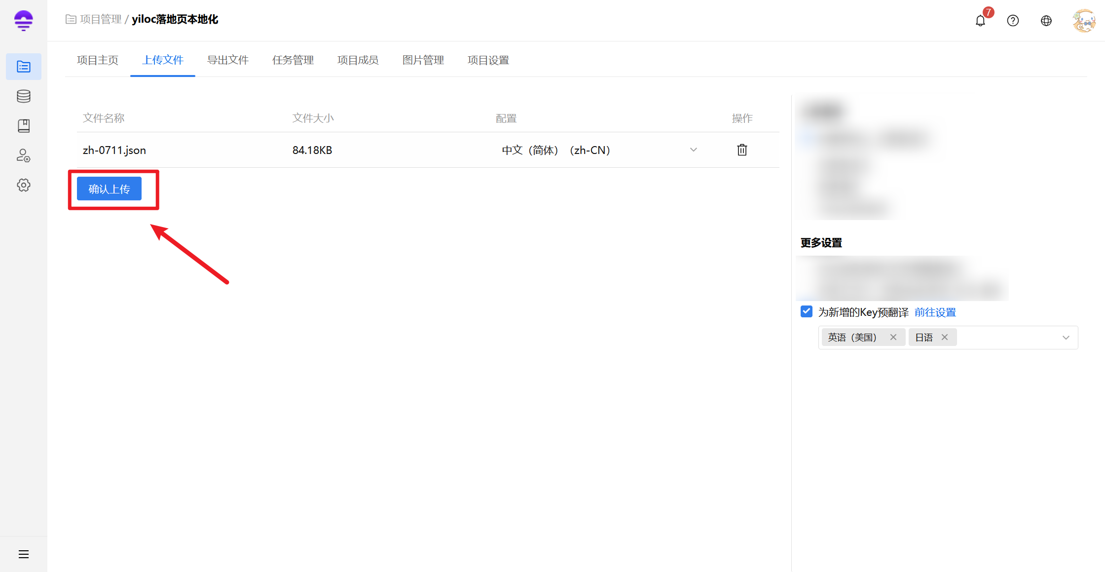 1.在【上传文件】页面,上传待译文件,勾选【更多设置】中的【为新增的Key预翻译】,并选择您要翻译的目标语种。如您未进行项目的预翻译设置,也可点击【前往设置】,快速设置。