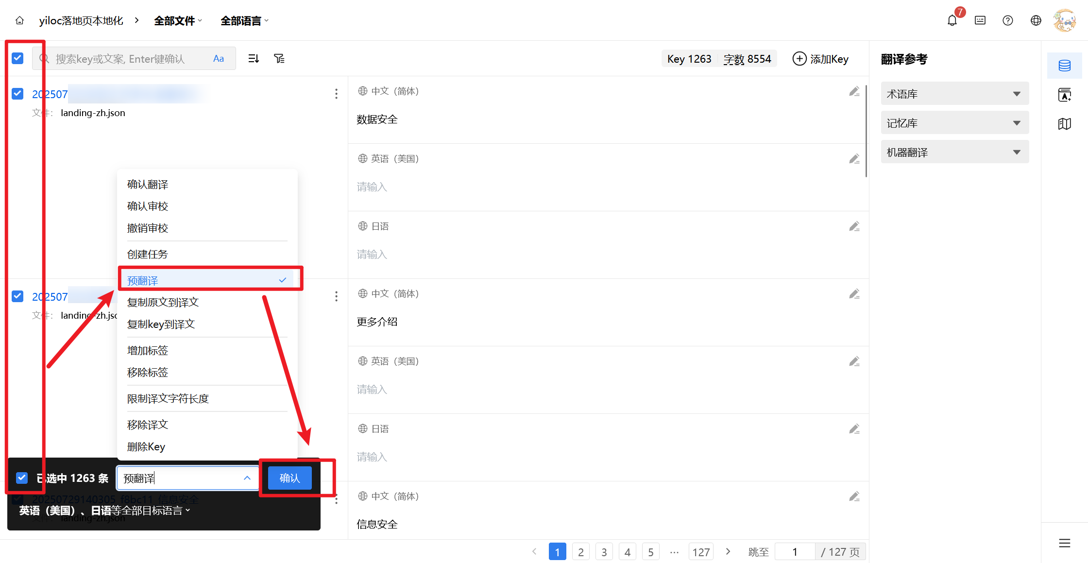 1.在编辑器页面,选中需要预翻译的Key。在批量操作弹窗中选择【预翻译】选项,并选择需要预翻译的目标语种,点击【确认】按钮。