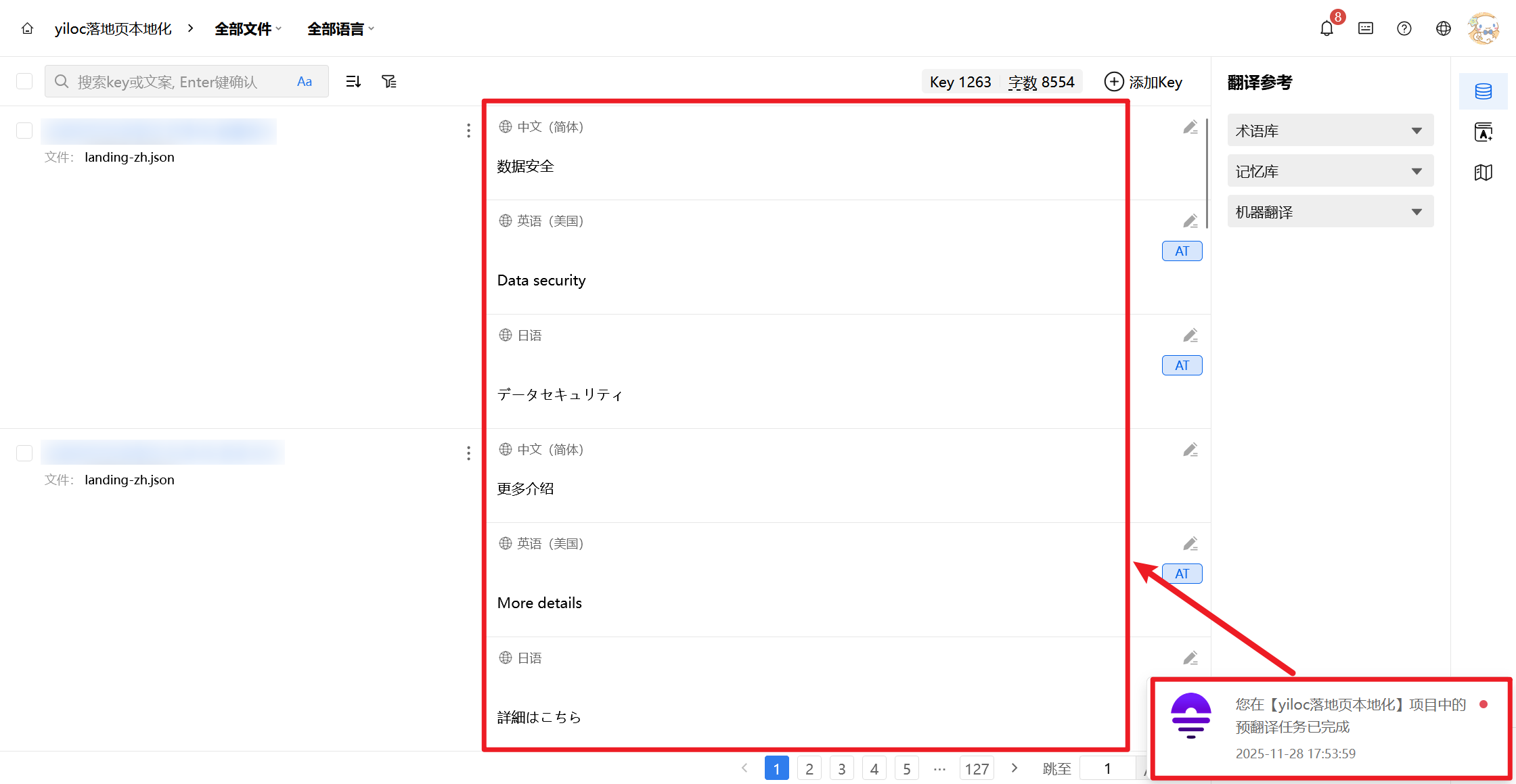在编辑器界面,项目经理或者译员可以选中一个或多个Key进行预翻译。