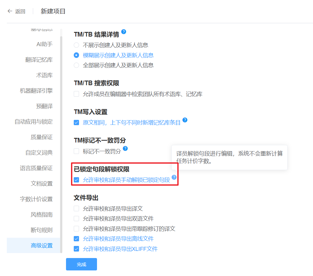 更新日志2025-10更新日志Version: YiCATOn this page2025-10更新日志2025.10.20 更新 允许译员和审校手动解锁已锁定句段 项目经理可在【项目设置】-【高级设置】中,开启“允许译员和审校手动解锁已锁定句段”权限。 对于已锁定的句段,如需进行修改,项目经理即可放开此权限,允许译员对已锁定句段进行手动解锁。