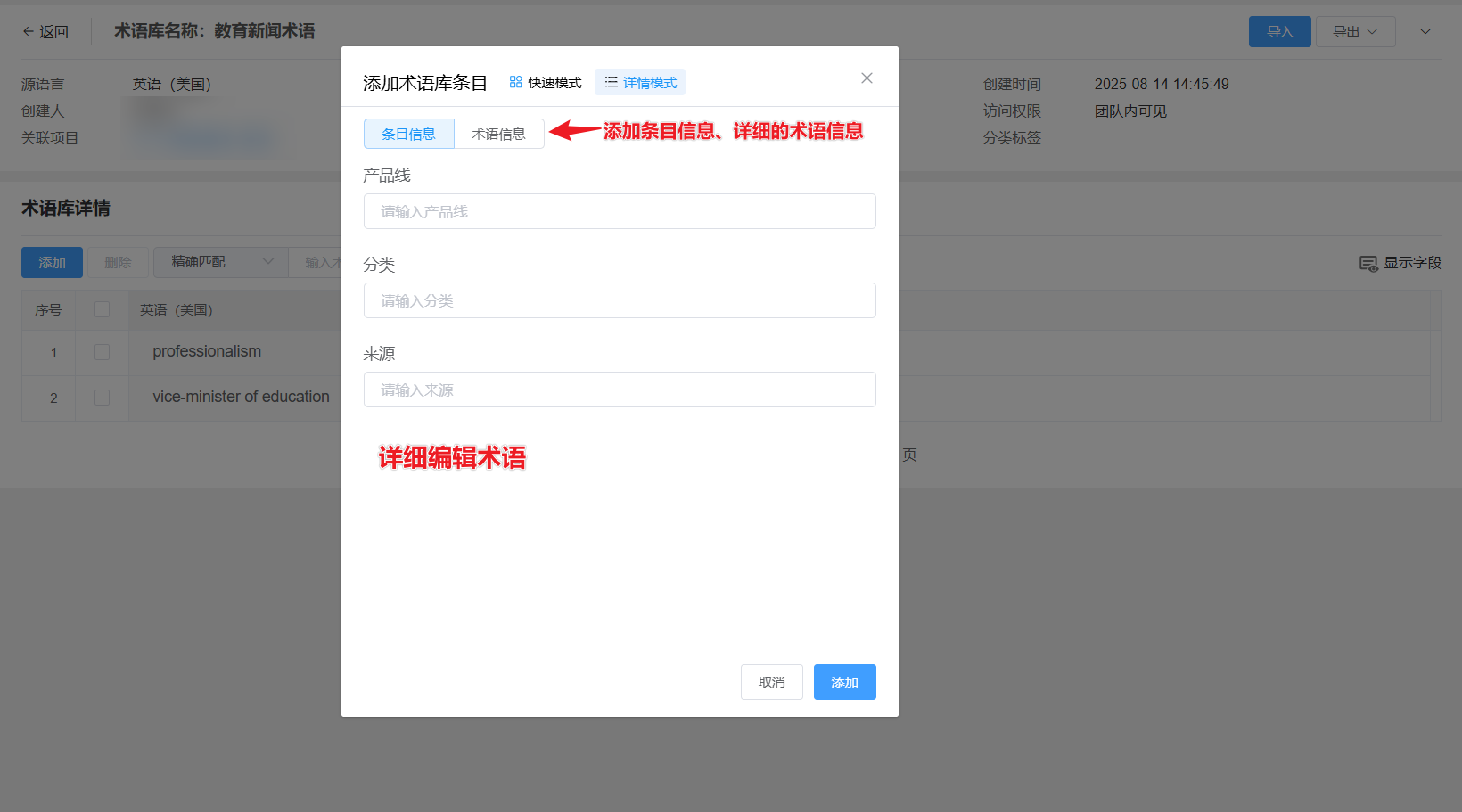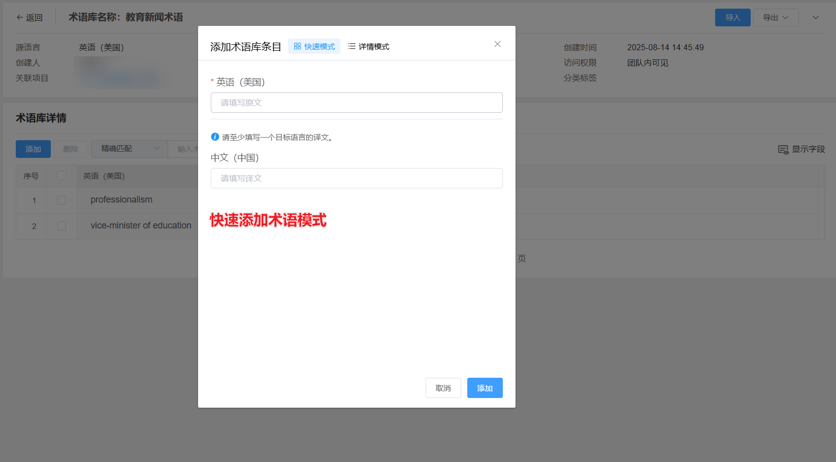 添加术语库条目时,支持切换“快速模式”与“详情模式”: